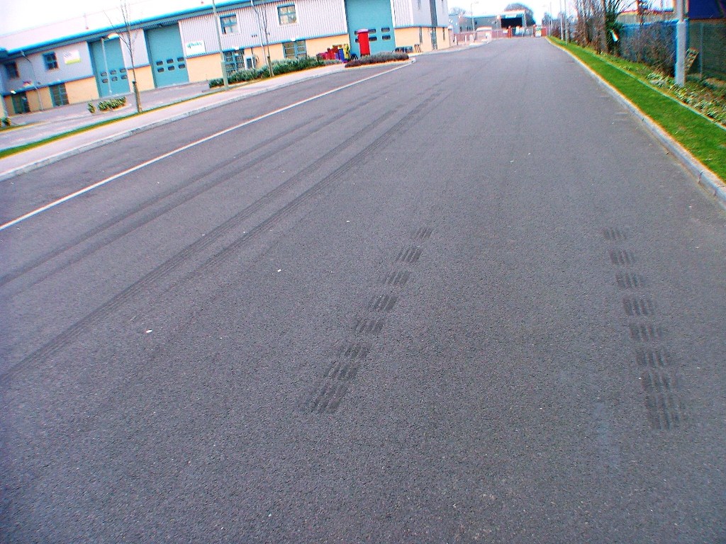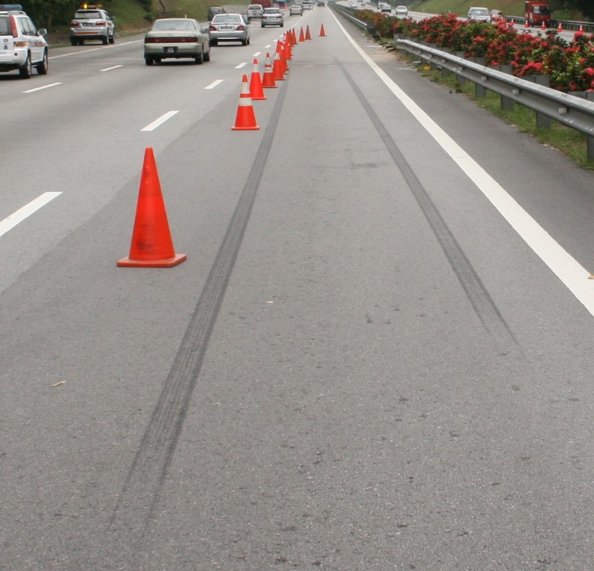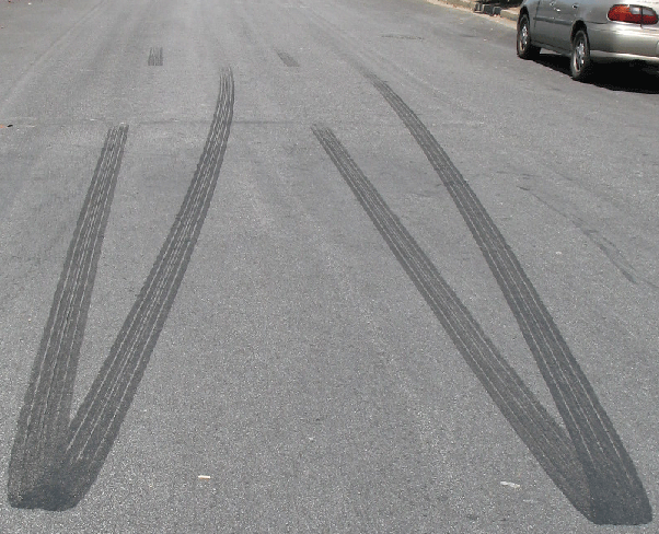 Do you see any difference between skid marks and acceleration marks? Looking at the beginning of the tire mark, all skid marks start out light and get darker as the skid continues. Acceleration marks start out dark and get lighter as the vehicle reaches its momentum. This is important, since as one case I investigated had a pedestrian pinned against a building. The dead body's torso was draped over the hood of the car which was still against the building. The operator claimed he tried to avoid the collision by skidding, but could not stop in time. The tire marks showed heavy friction marks at the beginning of the alleged "skid" and got lighter as the car reached the pedestrian and the building. Hence, the operator did not attempt to stop by skidding, but rather he committed murder by intentionally accelerating his car directly at the pedestrian.