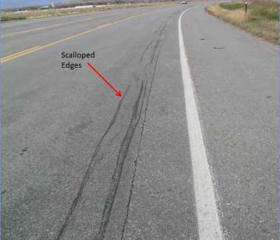 Scalloped ksid marks occur when the skidding tire looses inflation and the rubber tire collapses. The scallop marks demonstrated in the above photo that this vehicle had a "blow-out" and began sto skid to a stop.