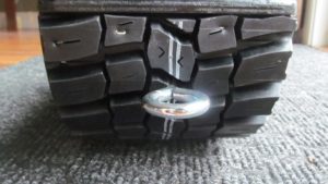 Finally to round out the above tire marks is the "Off-set" or "Jog". Many times untrained investigators look at the debris field at an accident scene. They believe the point of impact, (POI), is where the majority of the dislodged vehicle parts are scattered on the road surface. This is not an accurate determination of the POI. Looking at the photo of the off set or jog, you can see an abrupt change of direction of the skid. This is where the skidding vehicle came in contact with another object, most probably another vehicle traveling at a 90º angle to the skidding vehicle. At POI the skidding vehicle skids in the direction of the striking vehicle. If the vehicle strikes a fixed object like a building, the resulting tire mark is a scrub of the front tire which is wide and if the vehicle strikes the fixed object at an angle from the center of mass it will rotate in the opposite direction of the impact or to the side with the least resistance to the impact. For example, a vehicle strikes a utility pole with the left front bumper, which is lef to the center of mass the vehicle's right rear will swing out to the right.