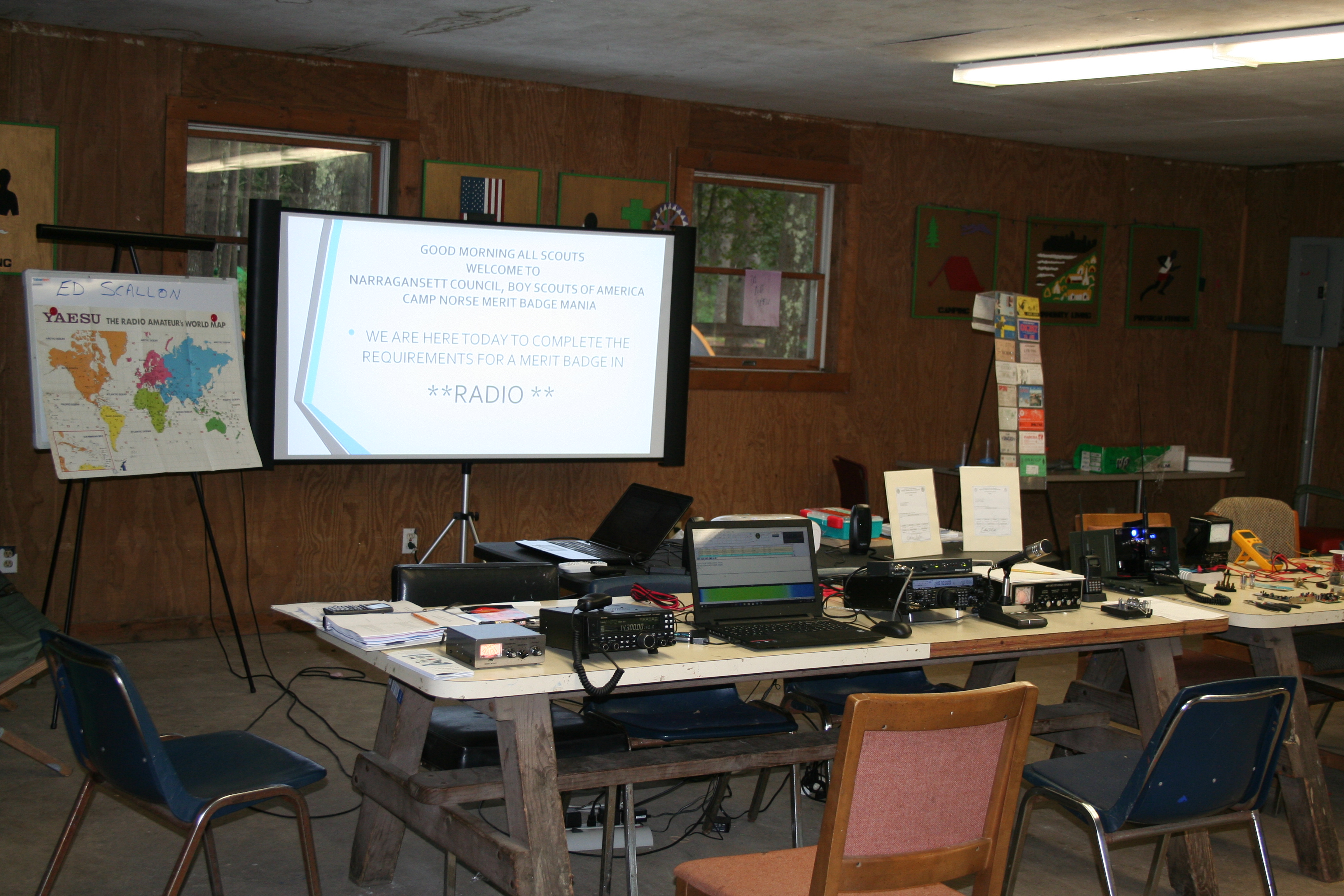 My name is Ed Scallon, and I was the Merit Badge Counselor for the Boy Scouts of America Radio Merit Badge Session held at Camp Norse, Kingston, MA on August 13, 2022. Like any other skill, knowledge and practice develops the essential tools needed to succeed. Amateur Radio, the center of gravity of our Sessions, requires a workable understanding of electronics and a rather unique method of communication. During this session, all ELEVEN (11) Scouts utilized their knowledge and experiences in preperation for this session by reading the BSA Radio Booklet. During the session each Scout prepared their own evaluation sheet which was initiled by myself as each completing the requied requirements. I also provided some examples of sample answers to the requirement(s). The required elements were presented in order, following the required elements outlined in your Radio Merit Badge Series Booklet. Through the efforts of the Narragansett Counsel BSA Executive Liaison / Chairman of the Merit Badge Mania weekend, we held this Session in the "Dinning Hall". In conjunction with the Radio Merit Badge requirements, the Scouts were eager to learn more theory, so electrical engineering principals were incorporated into the lecture. The good new is that after completing this Session, the Scouts are able to "sit" for their FCC Technician's Class Amateur Radio License.
